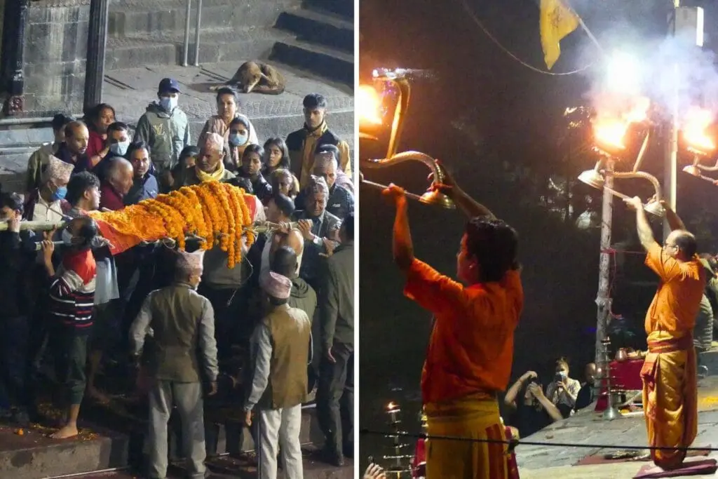 Walking through Kathmandu’s streets was fascinating. Monkeys, cows, motorbikes, scooters, cars, pedestrians all jostle for space on the roads and narrow streets. Concluded with watching a cremation on River Bagmati with noisy dancing performance opposite.