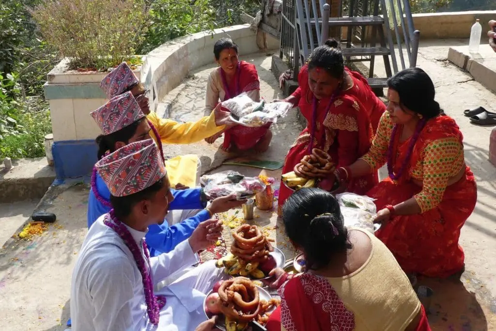 We were thrilled Anup invited us to join his family for the special celebration today. We drove to his uncle’s house in the countryside… to watch the ceremony where all the sisters painted dyes onto their brothers’ brows. Rituals are extremely important in Hindu society.