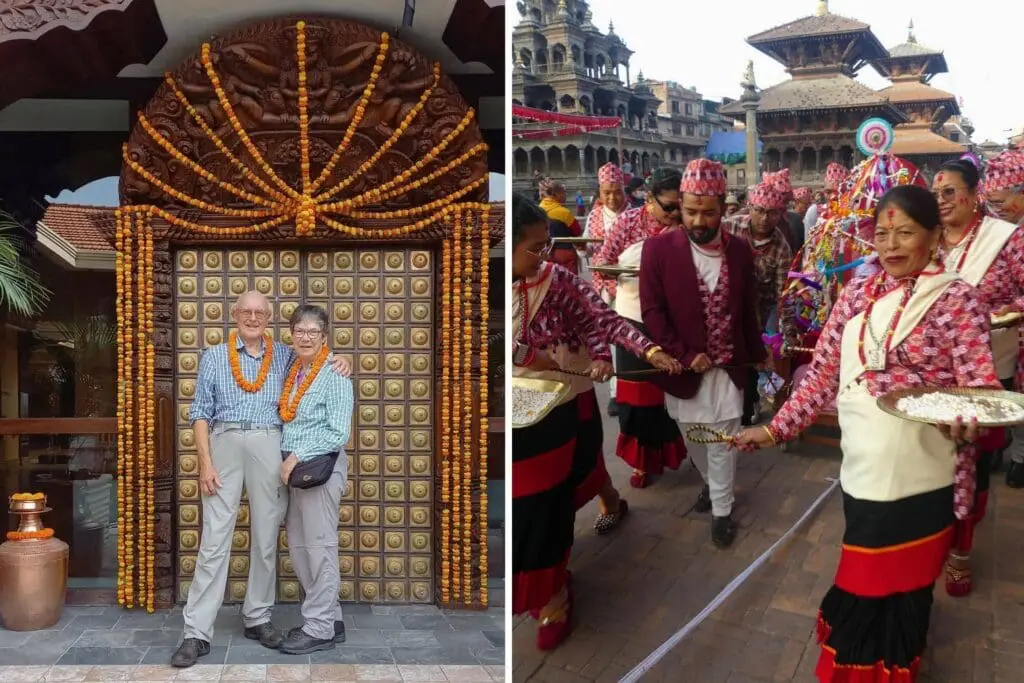 Anup, our guide, greeted us with marigold garlands – very friendly and warm. Because of Diwali and the first day of the Nepal Sambat New Year 1145, families were celebrating together in wonderful costumes, while dancing and singing at Boudhanath Stupa.