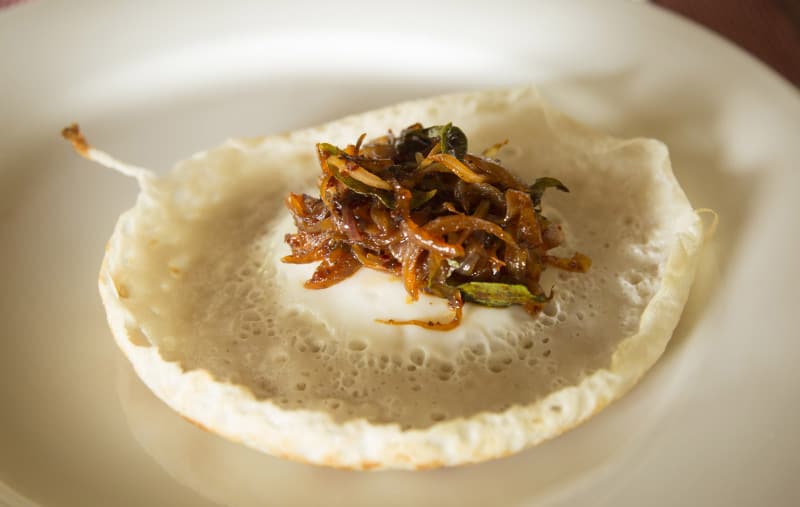 The plain hopper is a simple pancake that has been cooked into a bowl shape. Plain hoppers are typically eaten at breakfast and are served with a variety of accompaniments, like coconut sambol, lunu miris (a spicy onion relish), or dhal (lentil curry). They can also be enjoyed with a dollop of curd (yoghurt) and treacle for a sweet twist.