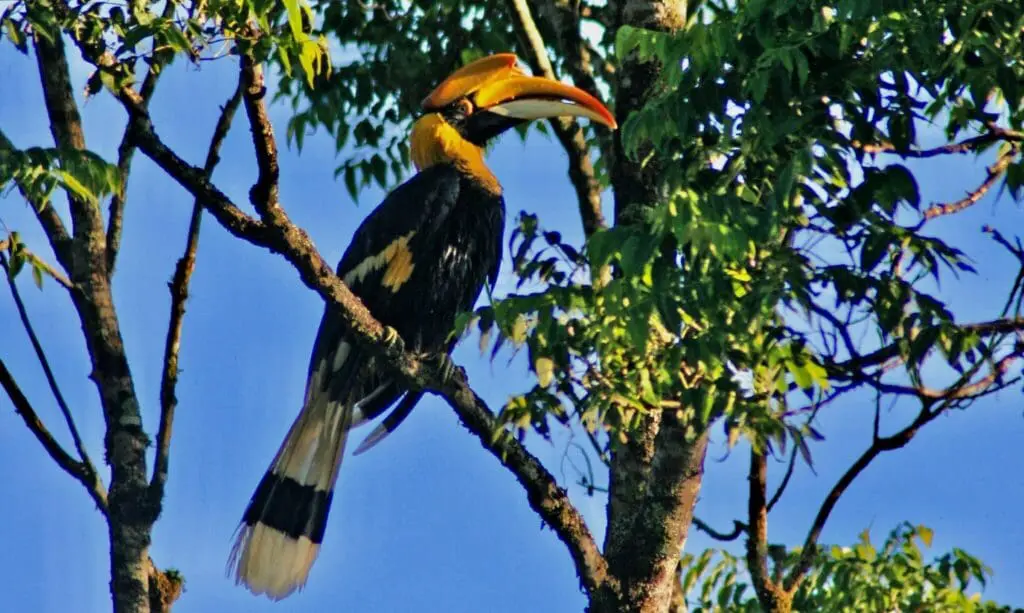 My all time favourite bird in India has got to be the Great Indian Hornbill. As it mostly stays in the heavily wooded jungles, sighting one in the wild is not easy. Locally called Mallamuzhaki Vezhambal which literally translates as the hornbill that resonates the hills, their calls are very distinctive like a loud booming human laugh. You often hear the flapping sound generated by its wings as it flies before you actually see it. The Great Indian hornbill is the largest of the 7 types of hornbill found in India. Due to habitat loss and impact of human interactions the Great Indian Hornbill was an endangered bird. Of late the new wildlife regulations and conservation efforts have been a great help in protecting this magnificent bird. In Southern India they are found mostly in the dense rainforests of the western ghats. The main areas to spot them are the forests of Periyar Tiger Reserve, the Thattekad region, the Nelliyampati hills and the Anaimalais. Due to the availability of decent accommodation the best option to visit would be Periyar and Thattekad. My personal favourite place to see them is the Periyar Forest Bungalow, the only private estate in the core zone of the National Park. The stay here is comfortable but not luxurious. The upper region of the estate is not planted and allowed to grow wild and in addition there are parts of the estate reclaimed by the jungle making it a haven for wildlife. Its here that you often get to spot the Great Indian Hornbill on the early morning walks. Feb/Mar is a good time for spotting them as that is their breeding season in the area.