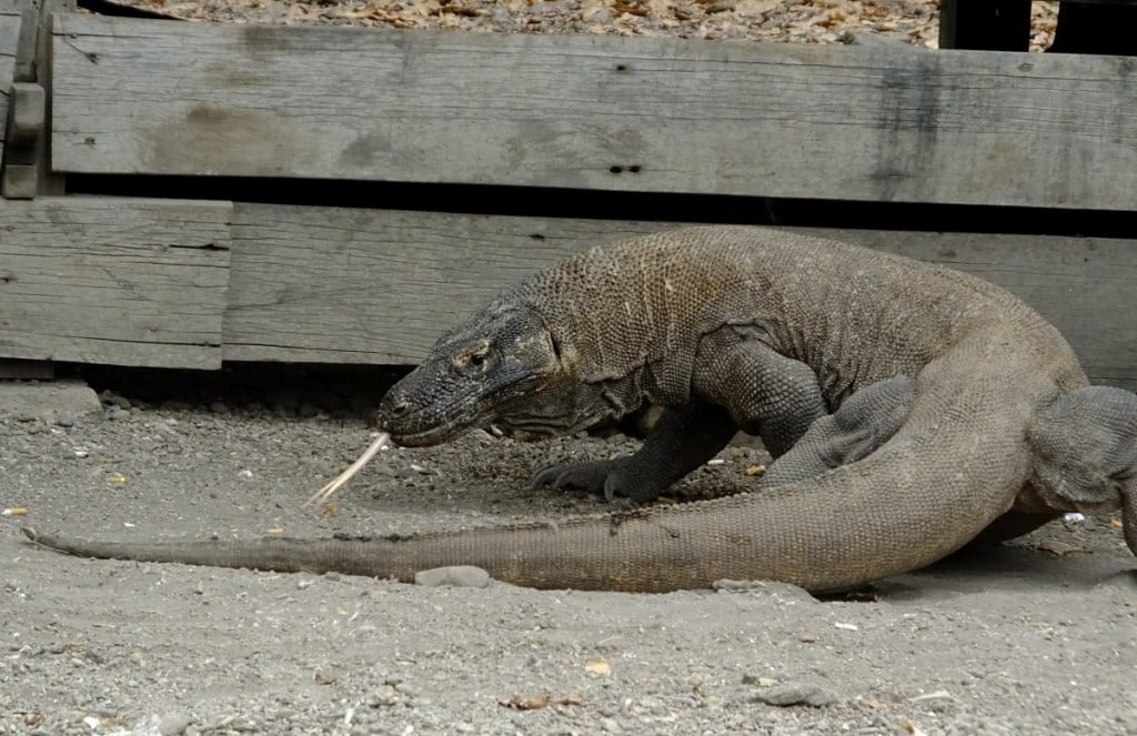 But can wildlife-watching be Dark Tourism? In this case: yes! For starters, Komodo dragons are man-eaters. And as Douglas Adams famously observed in “Last Chance to See” it somehow makes us uncomfortable to think of a lizard as a man-eating beast. We’re somewhat more tolerant of this if it’s a mammal, say a tiger or a bear, but a lizard? No, that’s too spooky. Furthermore, Komodos have a method of killing their prey that does not at all resonate with our anthropomorphizing ideas of a “fair fight”. It is now known that Komodos are venomous, but they also have saliva that is so full of bacteria that all a Komodo needs to do is get a quick bite in … and then wait. The victim, usually a deer or a buffalo, will then run away wounded, but the wound won’t heal due to the anticoagulants from the dragon’s bite. So they will slowly succumb to the infected wound. Then the dragons come to feast on the carcass. It doesn’t even have to be the dragon that did the biting in the first place, they happily take each other’s prey too. And their table manners are gross – they rip the carcass apart and swallow big chunks whole, bones, skin and all. They can consume about half their own bodyweight of meat in a single sitting.