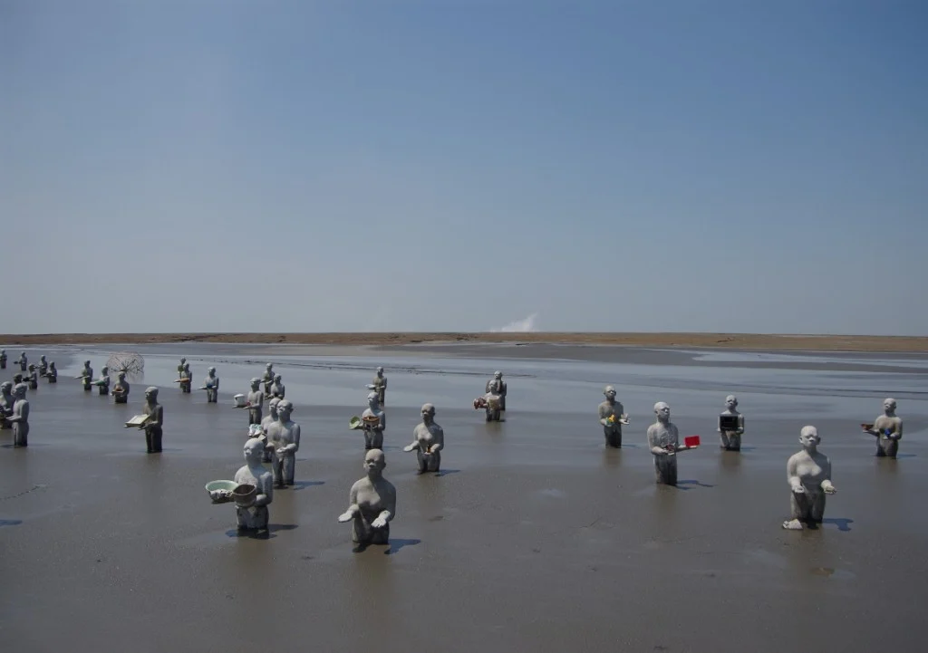 There are a couple of viewpoints on the dykes constructed to contain the mudflow. At the main one you can see a stunning monument by the Indonesian artist Dadang Christanto featuring about a hundred stony-faced concrete statues holding various household items – as the mud is slowly rising up to their knees, waists, shoulders … From these viewpoints locals offer visitors motorcycle rides further into the disaster zone and even onto the mudflow itself. You can indeed get fairly close to the original main source of the mud, still steaming away, though no longer splattering mud out in big bubbles (that, however, you can see at another site: Bledug Kuwu).