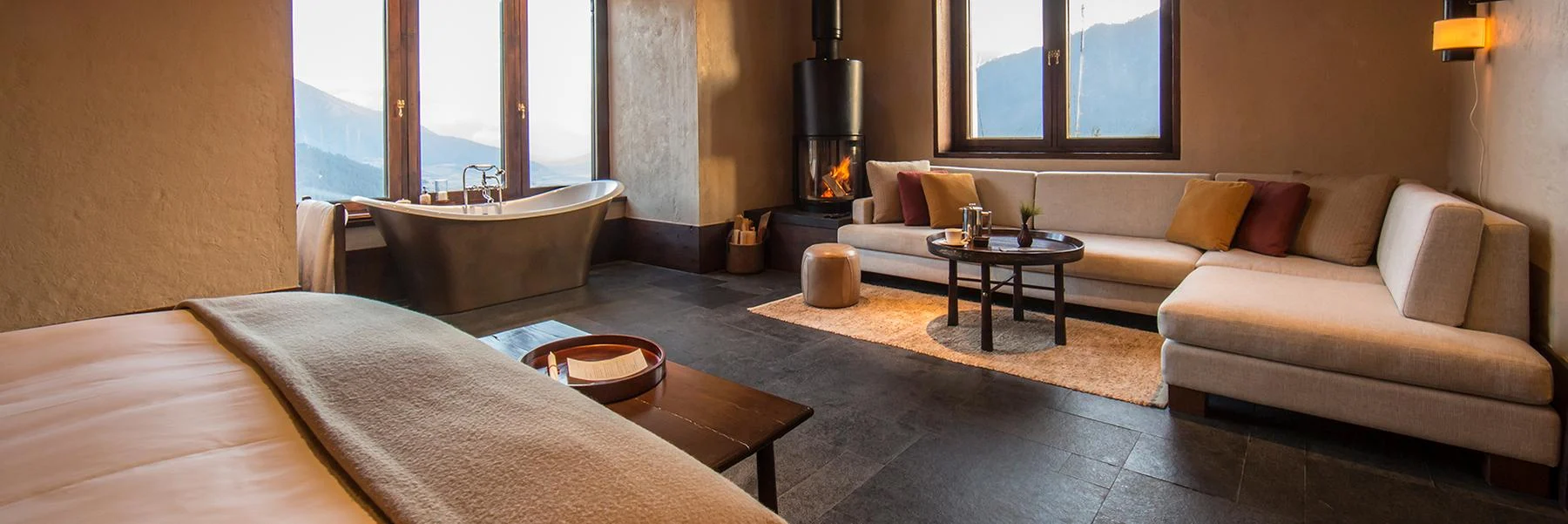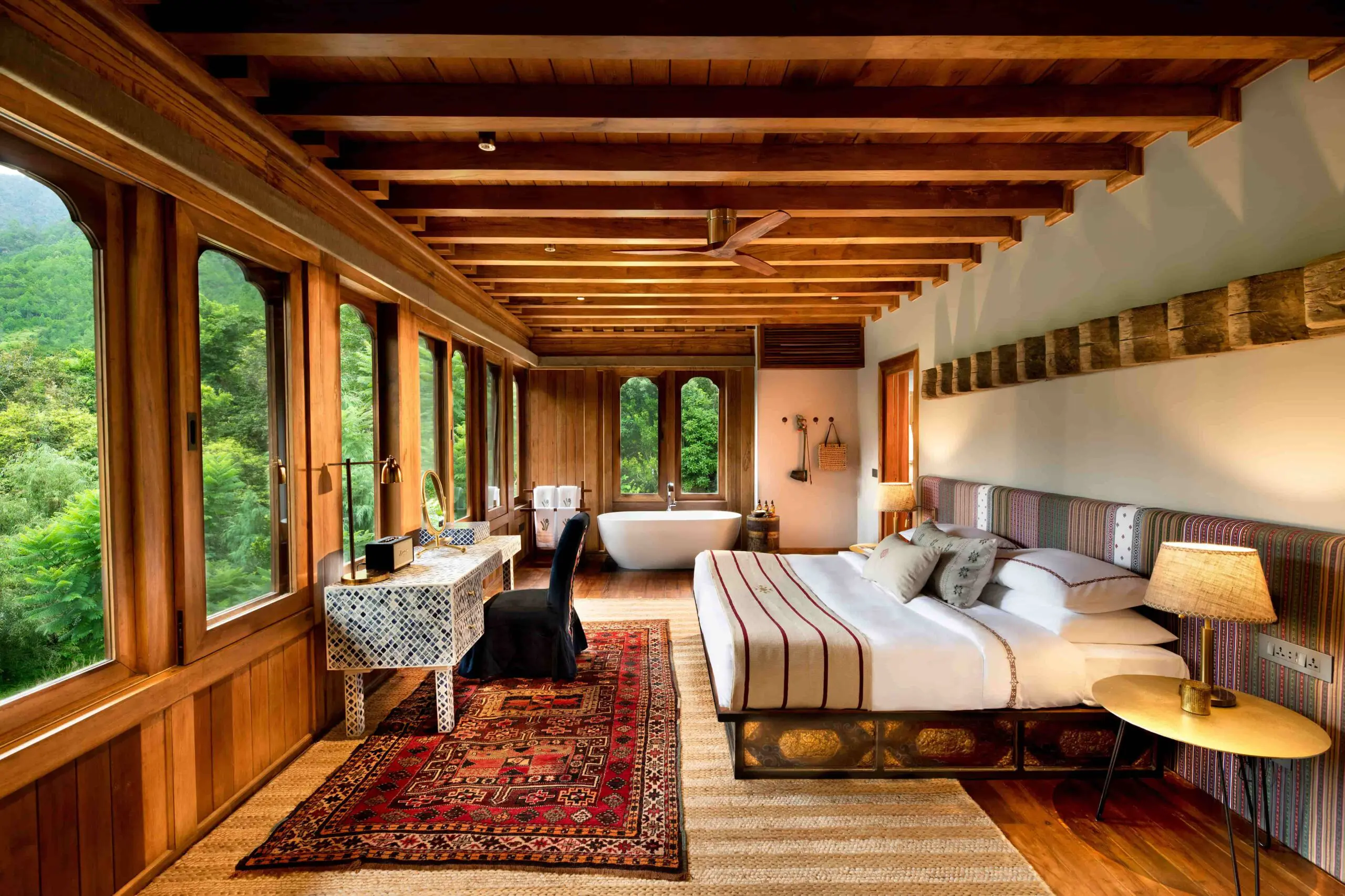 Six tented suites are crafted in a safari style with a Bhutanese timber frame, where you can sleep under canvas without giving up complete comfort. Polished wood interiors, a wood-burning stove, and indoor-outdoor bathrooms, with a ‘star bath’ beneath a sky light.