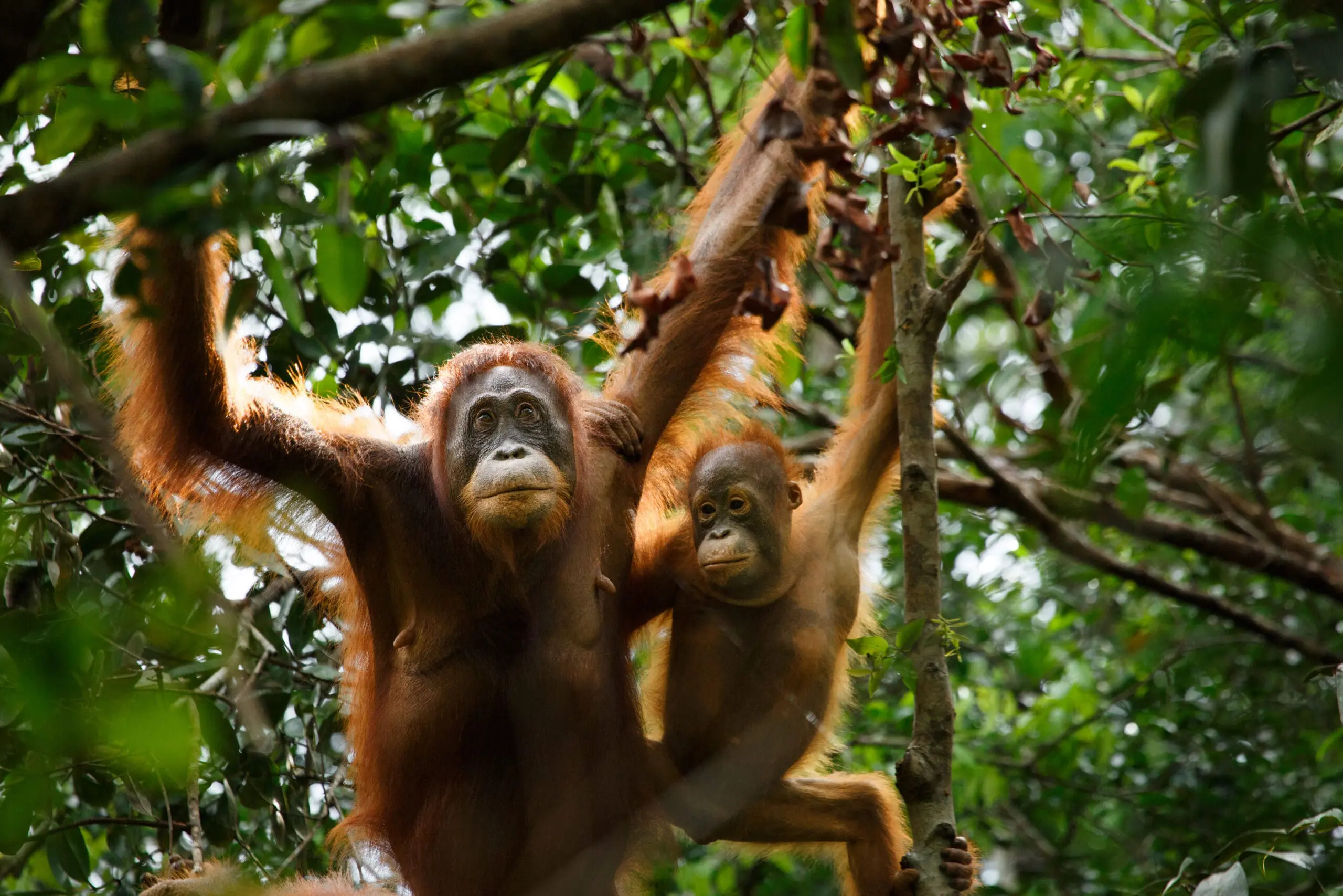 In the lush green heights of the Sepilok forest canopy, mischievous orangutans swing around wildly in their native habitat.