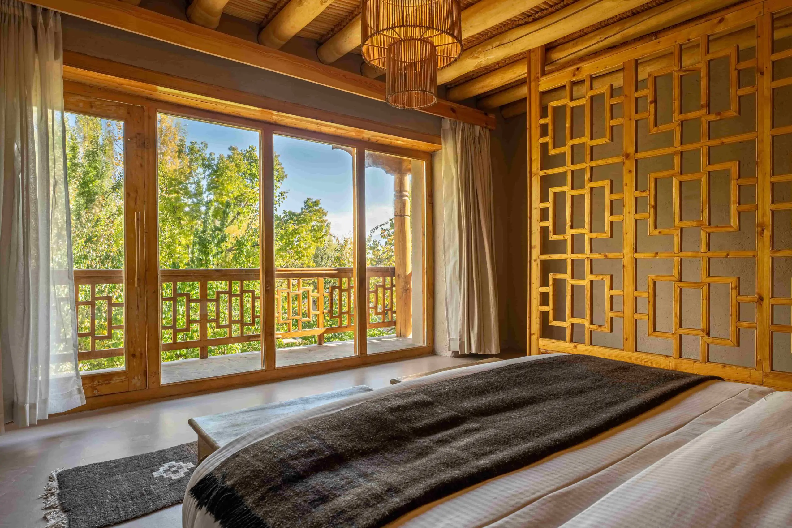 Each one feels spacious and inviting, with extra blankets tucked into carved wooden trunks and a balcony view that shifts with the seasons: snowy peaks in winter, apricot blossom in spring.