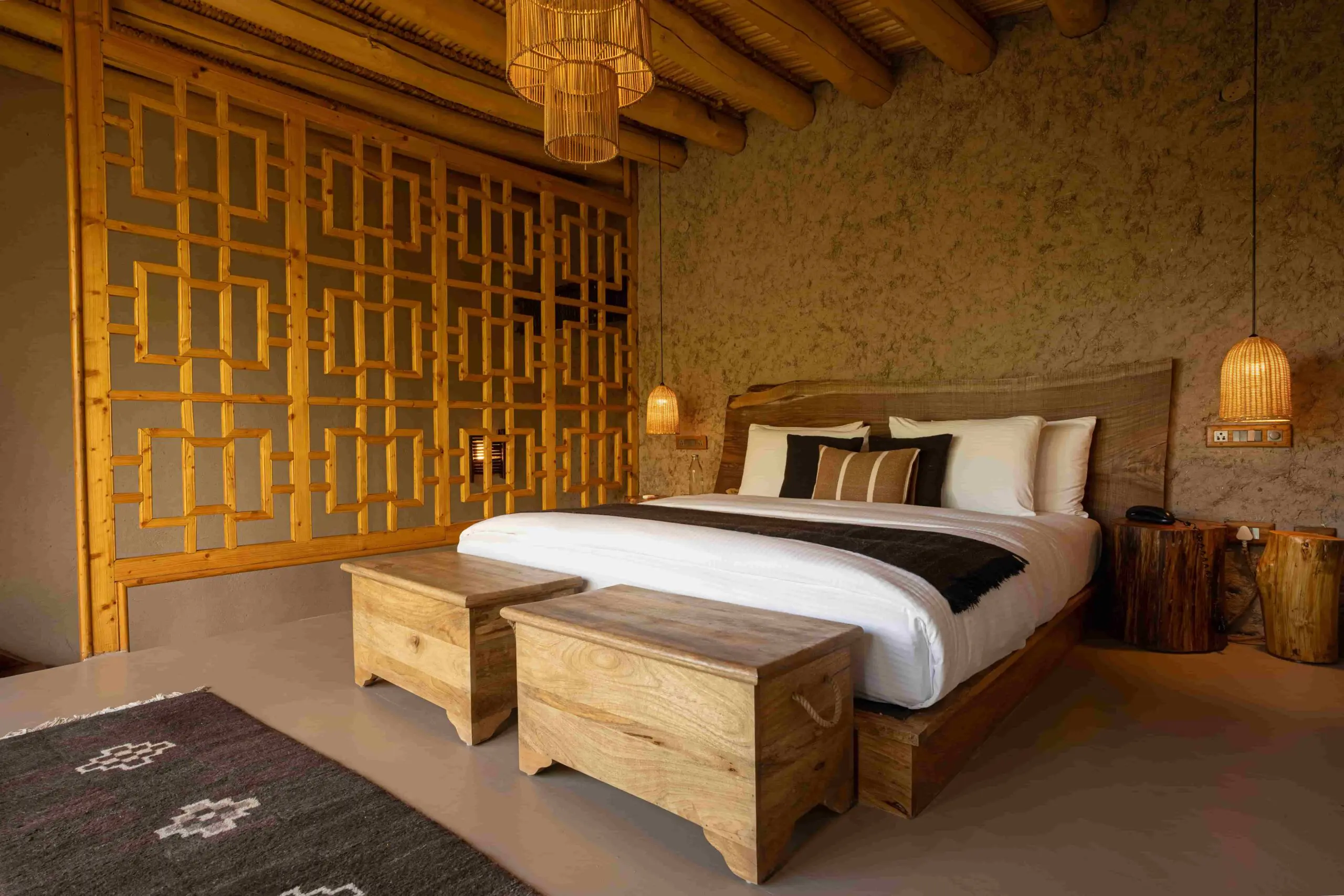The rooms at Dolkhar are designed with a minimalist Ladakhi aesthetic, featuring wooden furniture, clean lines and tactile, locally sourced materials. Each of the villas feels calm with soft, earthy-toned rugs, yak-wool throws and cushions handwoven by women from Kharnak.