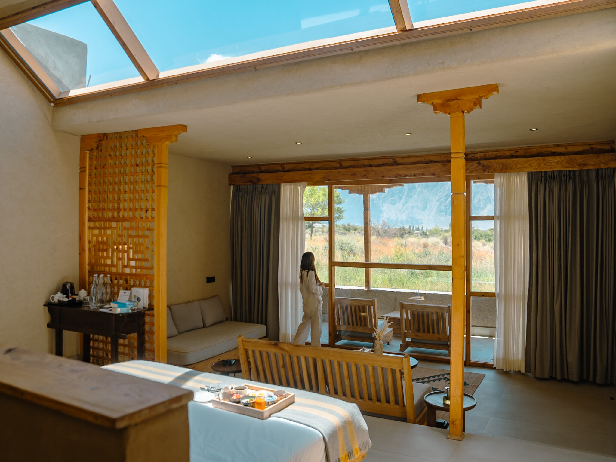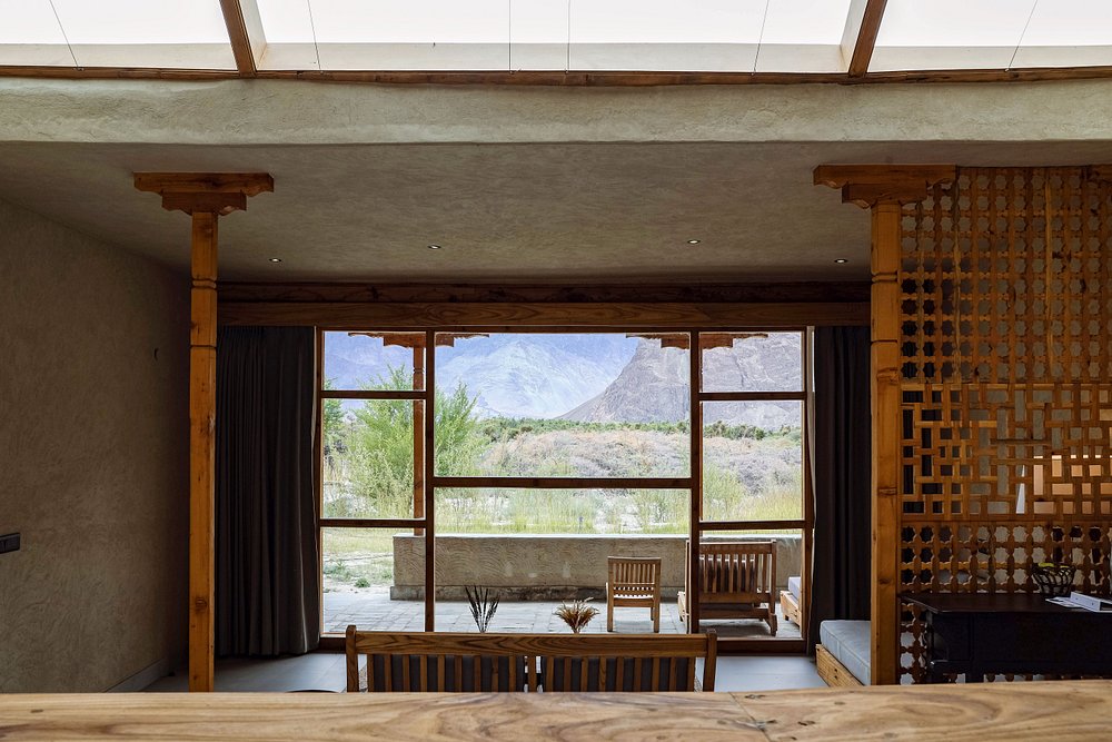 There are 16 spacious rooms spread across eight cottages. Each is generous in size and grounded in place. Designed with traditional Ladakhi elements and locally sourced materials, they showcase intricate craftsmanship without feeling overdone.
