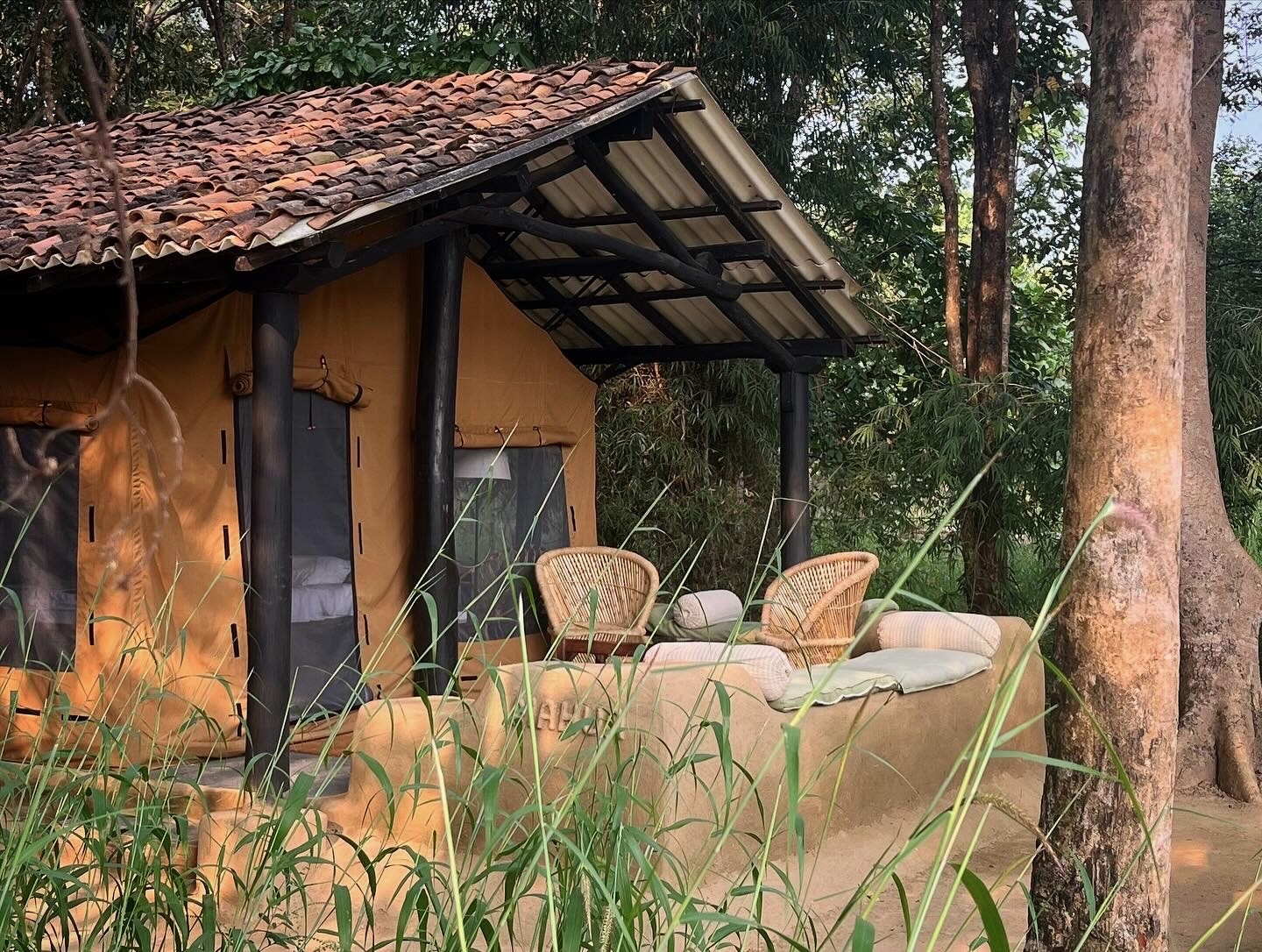 KAAV Safari Lodge is an intimate luxury retreat perched at the edge of Nagarhole’s lush Kabini forest. With just four beautifully appointed rooms, two elegant glamping tents, and a private pool villa, this boutique lodge combines stylish design with a peaceful, immersive wilderness setting. Between safaris, relax on the deck with forest views, listen to birdsong by the pool, or gather for alfresco meals under tree canopies.