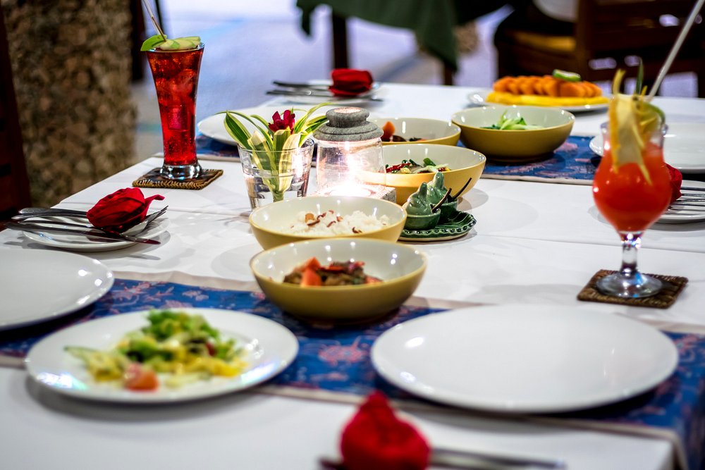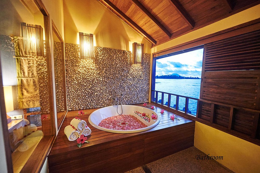 Lush, colourful gardens surround the property and pool area, offering pretty spots to soak up the sunset over the ocean. Local and international cuisine is served at the Deho Restaurant & Bar on the open deck over the water and under the stars.