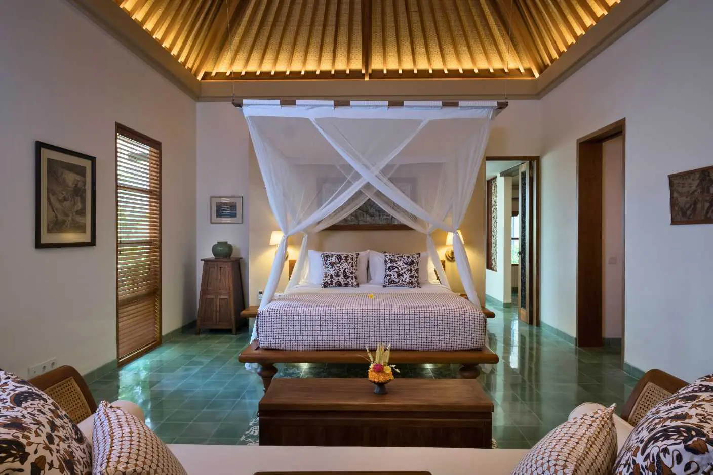 With around 30 thatched bungalows (stand-alone villas) tucked into the gardens, each reflecting quintessential Balinese architecture with high thatched roofs, antique furnishings, batik floor tiles and carved wooden details.