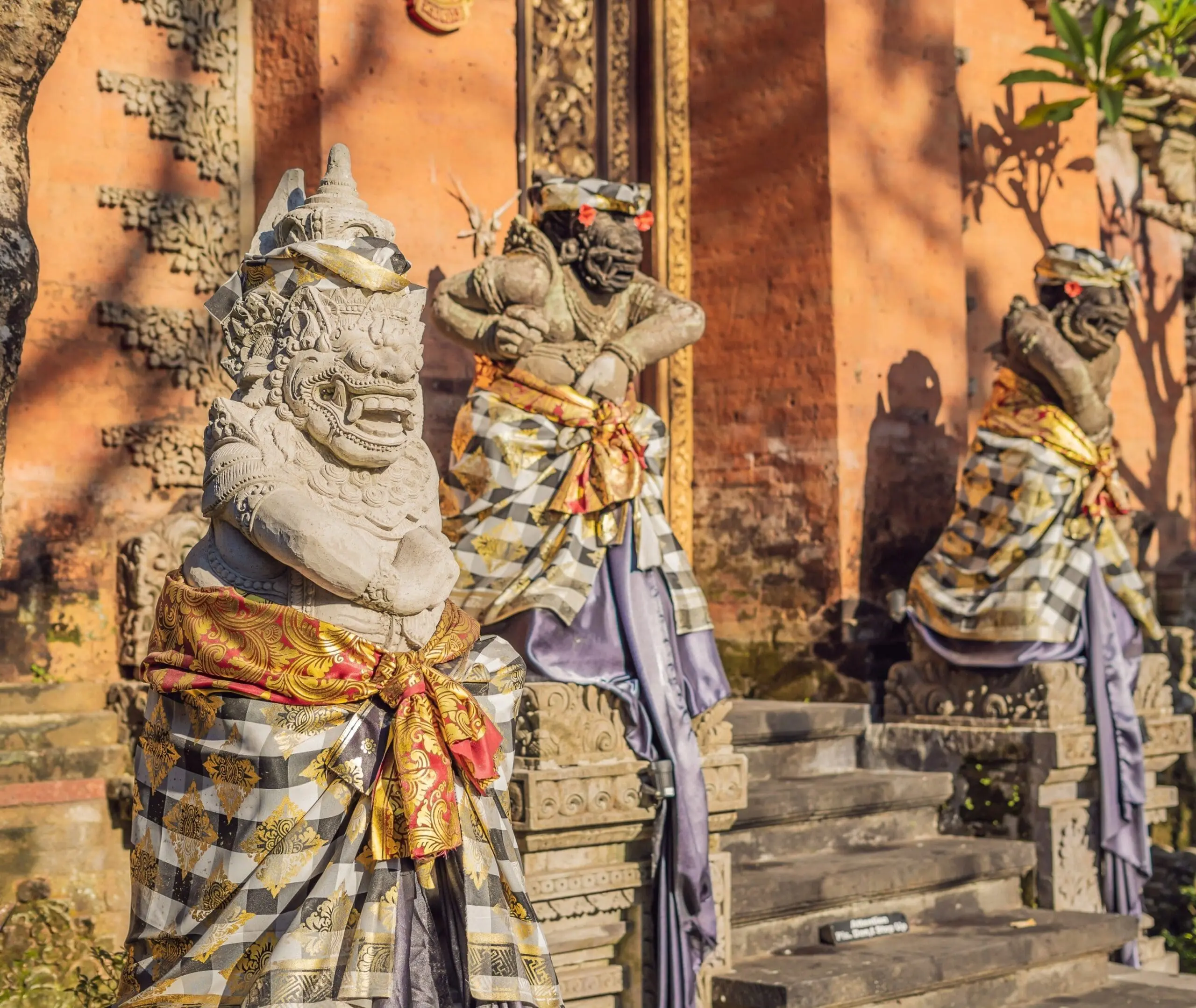 West of Ubud, you will find the Bedulu archaeological site and famous Goa Gajah cave and ritual pools, as well as numerous lesser-known historical carvings and temples that are worth a visit. To the south of Ubud is Gianyar Regency’s crafts centre, with villages such as Mas, Celuk and Sukawati featuring wood carvings, silverwork and art workshops respectively. The area tends to be quite touristy, however, you can avoid the crowds by exploring the beautiful surroundings. Dive into the ancestral megalithic traditions in Batuan, while discovering canyons, waterfalls and picturesque rice paddies.