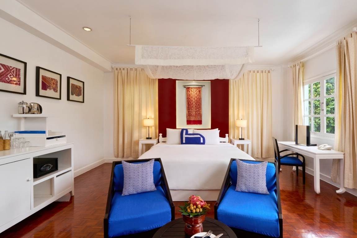 Interiors are classic and a little contemporary, with dark wood furnishings, oversized beds and subtle Lao design touches that reflect the building’s heritage.