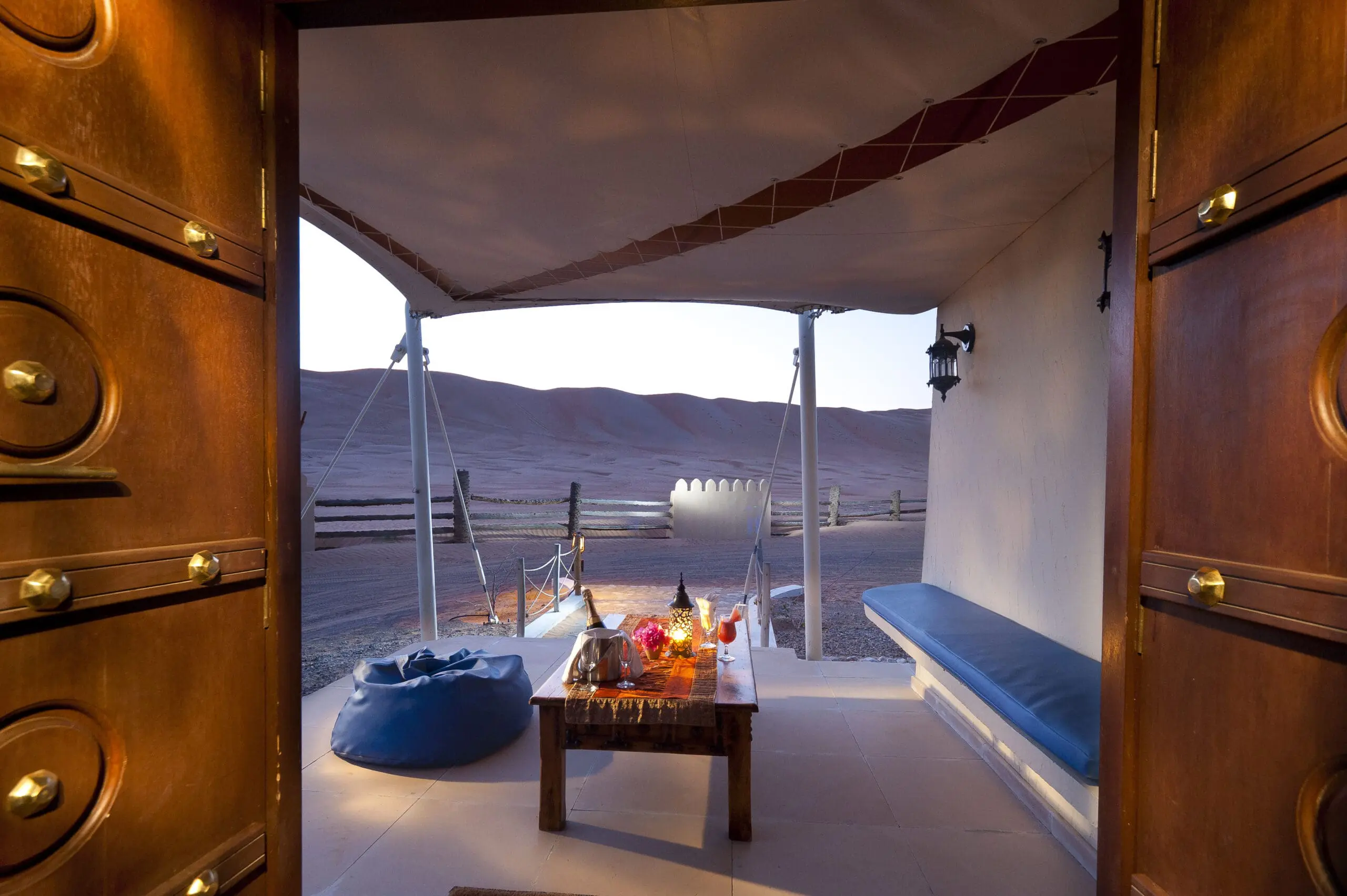 This luxury tented camp sits amongst rolling red sand dunes and wadis, looking out to rugged mountains in the distance but just a two hour drive from Muscat.