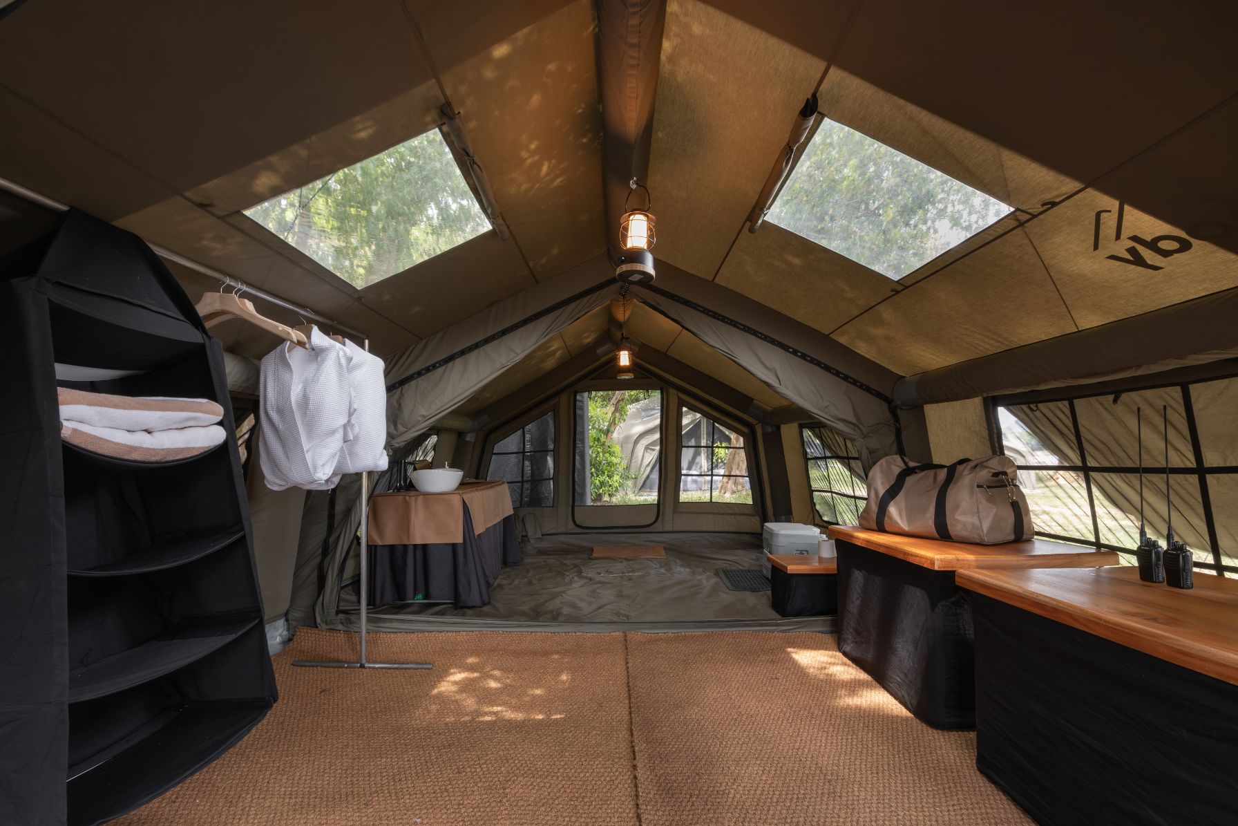 Power is solar throughout, with device charging available in each tent.