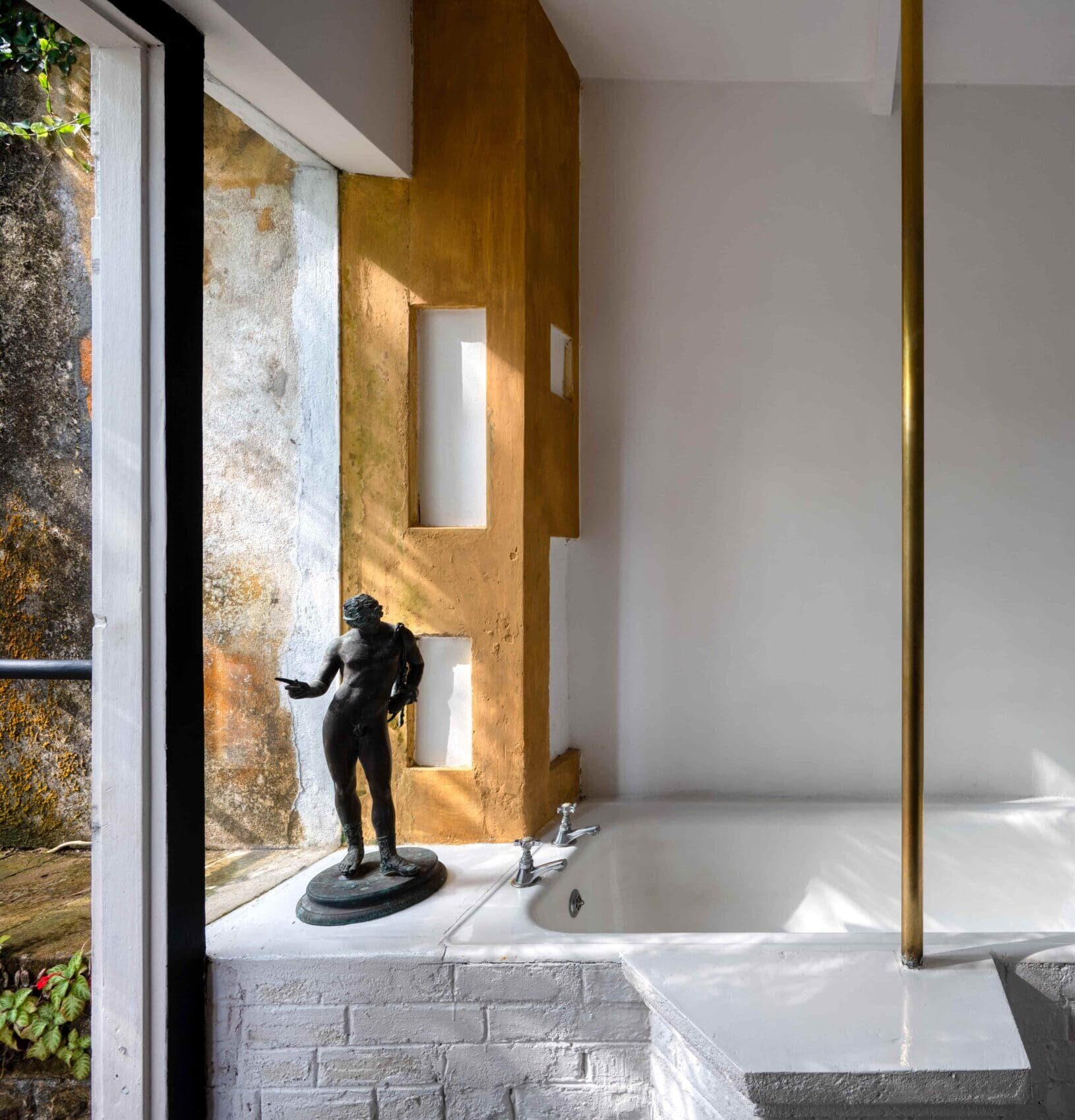 Antiques, sculptures, and a big old tub complete the guest room, and moss scales the courtyard walls.