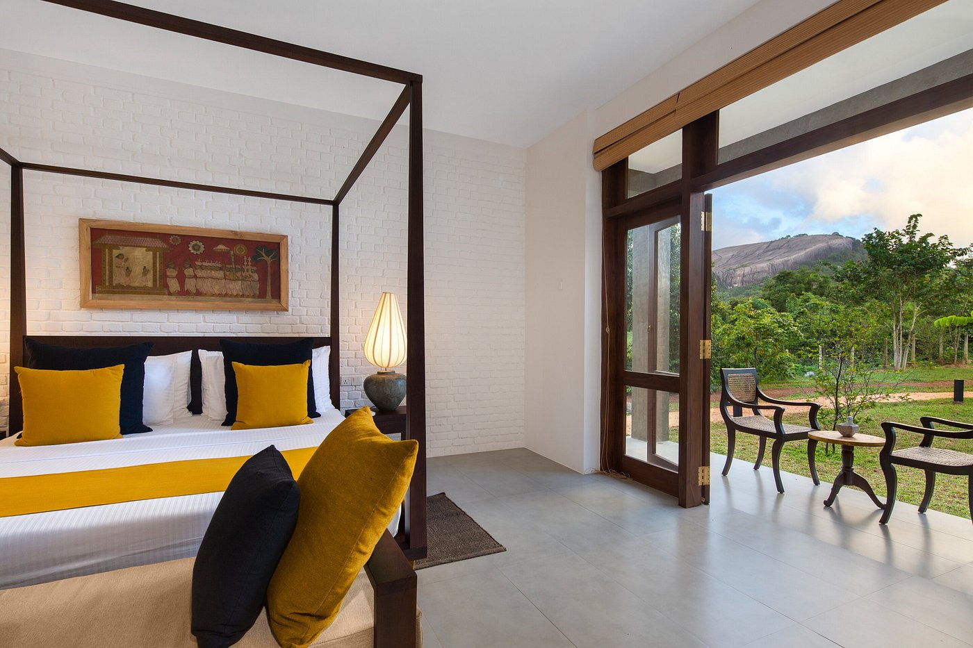 Although all the rooms are spacious and well decorated with colourful themes and a distinctly Sri Lankan vibe, we’d strongly recommend the upper-level options, as the views of Sigiriya and Pidurangala are best enjoyed from the balconies.