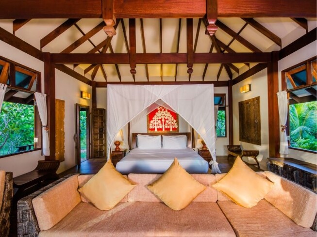 Each of the 24 villas is unique, with sea or garden settings and views, and 10 of them have private pools. There is a great range of accommodation to suit couples, groups and families, with one to five-bedroom villas available. Inside, they are spacious and open-plan, with a Thai-inspired design, art and antiques.