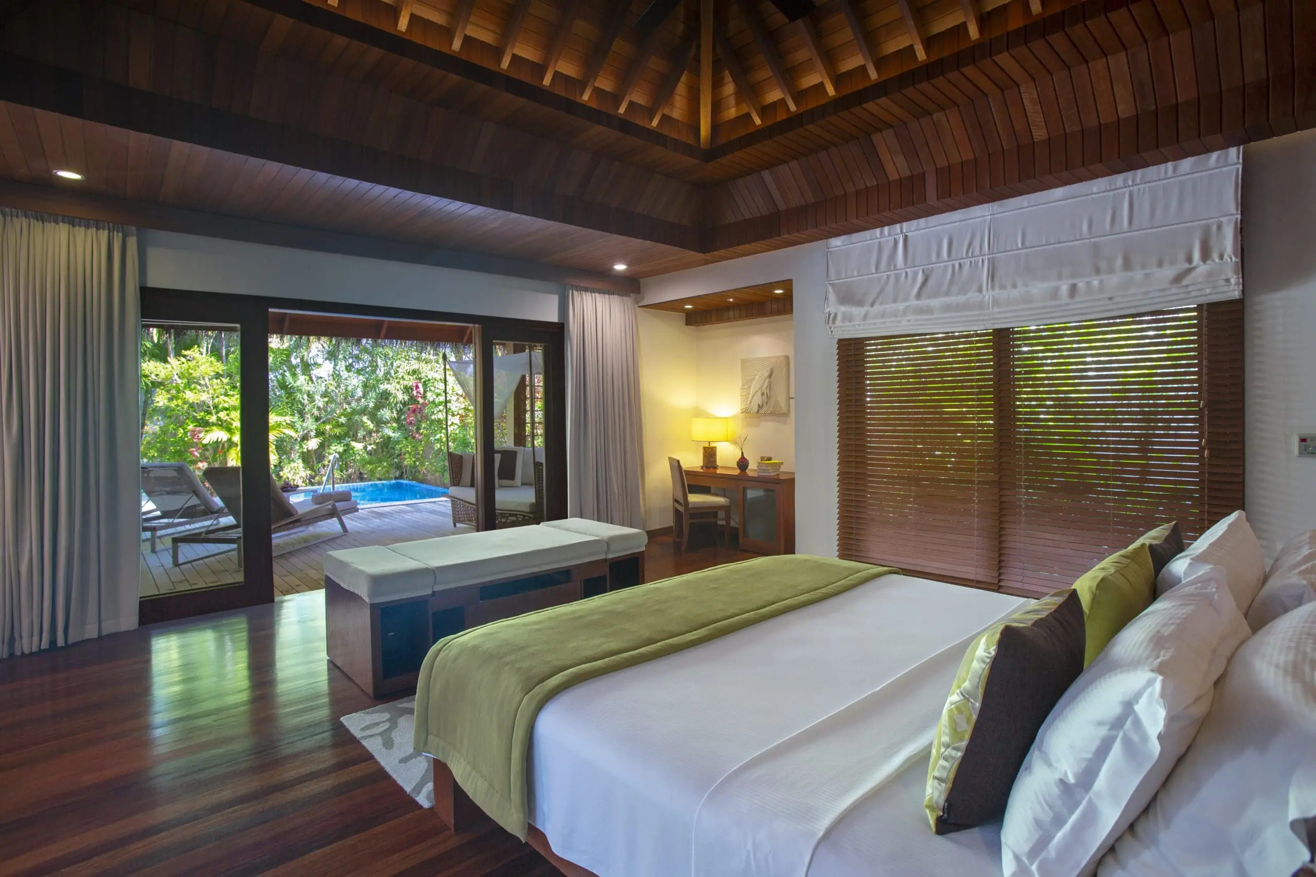 The 45 beachside villas open up to direct beach access and are surrounded by lush exotic vegetation, the 30 over-water villas look out over the pristine waters and tropical marine life. Villas range from the impressive Baros residence, found in a walled garden at the centre of the island, to the tranquil beach villas next to the lagoon. Seven Premium Pool Villas and 5 new Pool Water Villas are available as well. All rooms are contemporary in design using bright colours with natural light and deep teak wood creating an atmosphere of understated sophistication and elegance.