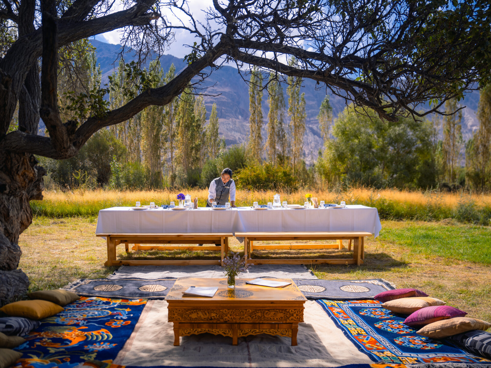 Your adventure continues with a thrilling drive over the Khardung La Pass, one of the highest motorable roads in the world, to the Nubra Valley. Spend two nights at The Kyagar, where you’ll enjoy farm-to-table experiences, including a picnic lunch with local delicacies. Visit Ensa Monastery to admire its impressive mural art, and take a walk through the village, soaking up the tranquil atmosphere of this remote corner of Ladakh.