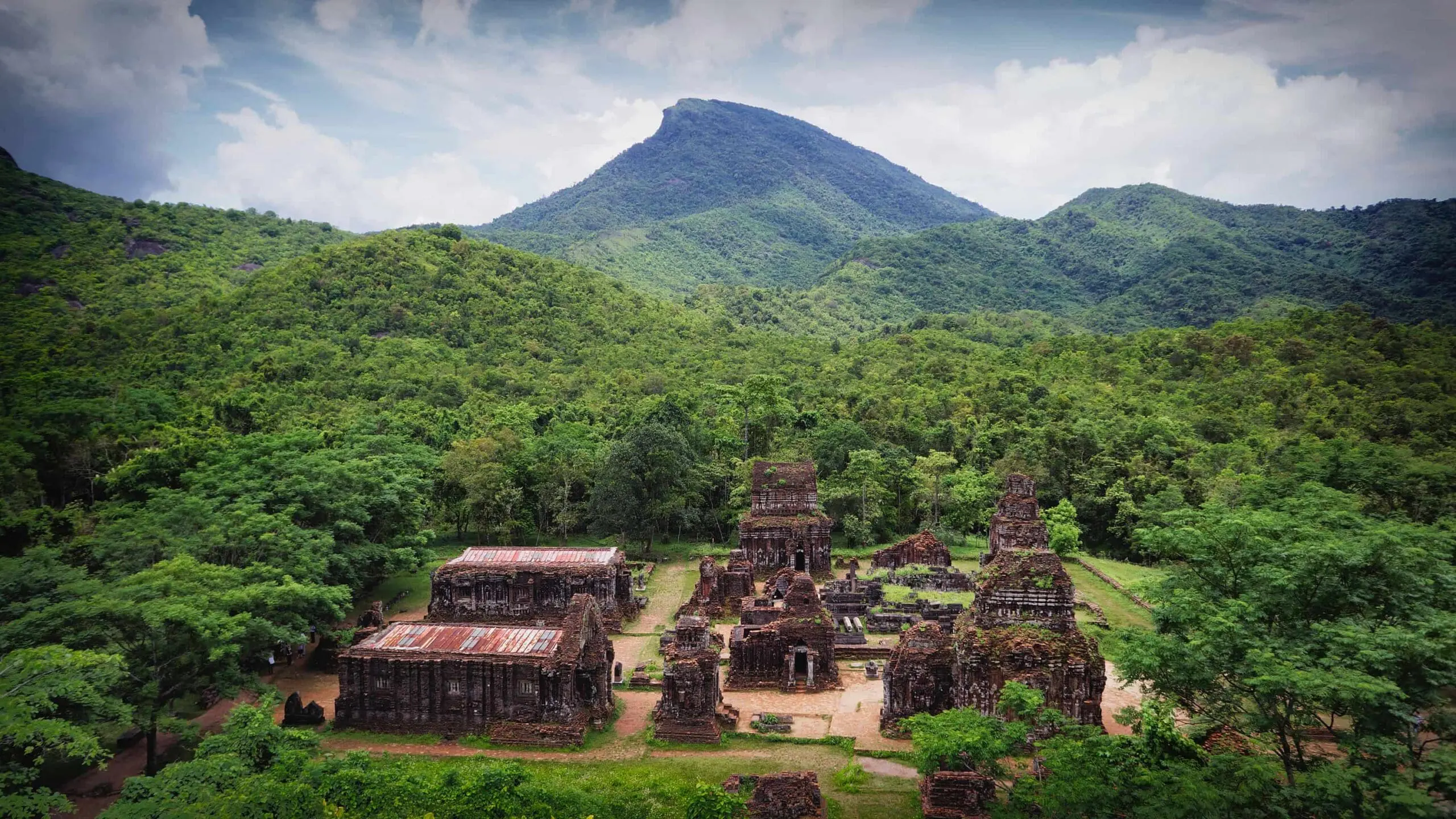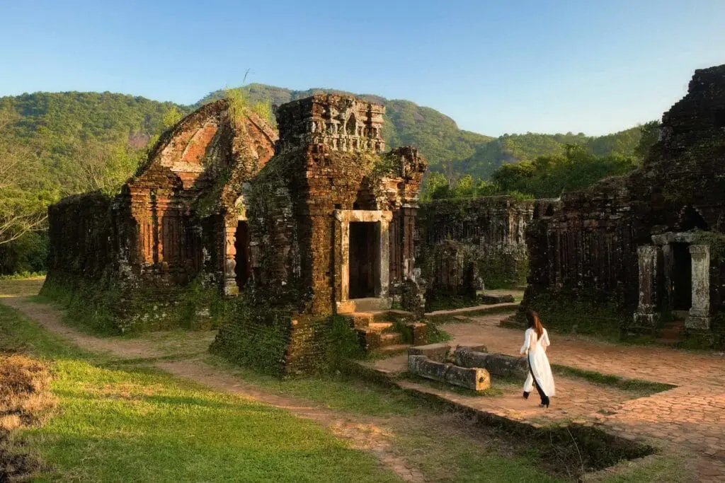 Often referred to as the mini “Angkor Wat” of Vietnam, the Cham ruins at My Son are well worth the slightly arduous journey needed to reach them! Your day will begin with an early morning drive from Danang/Hoi An through 60 km of rolling countryside, passing through small towns with markets in full swing, often journeying alongside the wide reaches of the Han River. As you draw closer to My Son, which translates literally as “Beautiful Mountain” the condition of the road begins to deteriorate and the last few kilometres of track are often rutted and potholed. On arriving at the My Son area and after crossing a bamboo “Monkey Bridge” you will transfer to a local jeep for the last spectacular 3 km bump and jolt along a river gorge. Finally, a 500m walk through lush hillsides, trees and brush, before emerging into the main site.